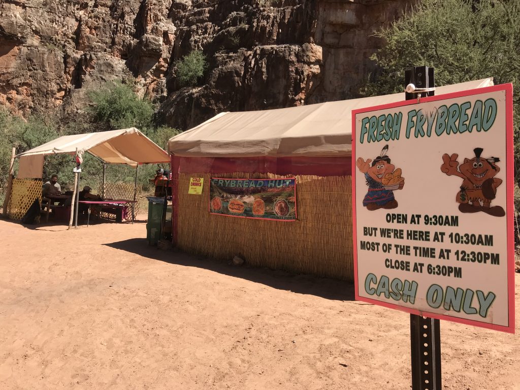 Note: Please do not rely on the Frybread Huts for food while camping. The sign says it all! Just a great treat if you happen to catch them while they’re open. For more reliable hours, visit the Supai Cafe or Sinyella Store in the village.