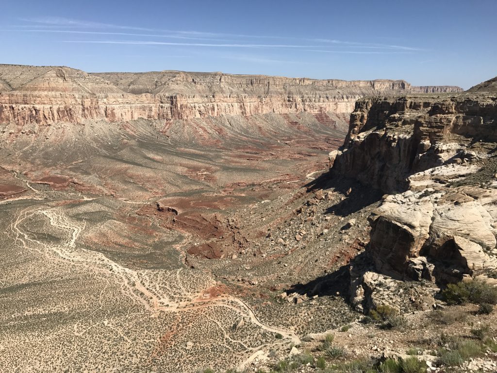 The view from the top of Hualupai Hilltop. You can see the trail at the bottom of the switchbacks descending into the canyon as it turns into the dry riverbed.